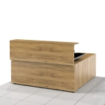 Eleganckie biurko recepcyjne narożne składające się z szafki z czterema szufladami i dostawki i z drzwiami i wnęką. Na szafkach osadzony jest pogrubiony blat spoczywający na czterech metalowych nóżkach o wysokości 10 cm. Biurko posiada wysuniętą do przodu nadstawkę oraz blendę - osłonę przednią. Biurko występuje w wersji prawej i lewej.