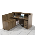 Eleganckie biurko recepcyjne narożne składające się z szafki z czterema szufladami i dostawki i z drzwiami i wnęką. Na szafkach osadzony jest pogrubiony blat spoczywający na czterech metalowych nóżkach o wysokości 10 cm. Biurko posiada wysuniętą do przodu nadstawkę oraz blendę - osłonę przednią. Biurko występuje w wersji prawej i lewej. Dodatkowo biurka mają ścianki boczne na wysokość biurka.