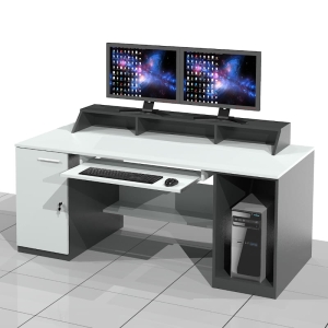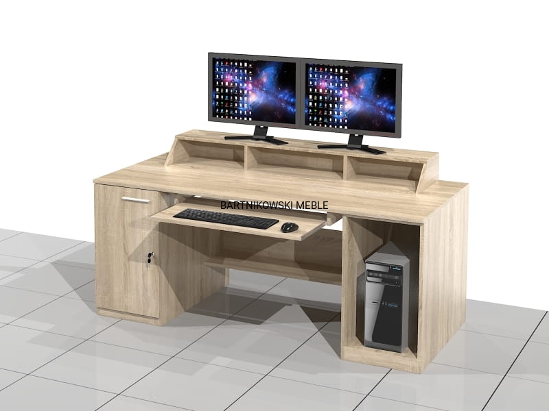 Duże biurko komputerowe GIGA-DW składa się z wnęki na komputer oraz szafki z drzwiami, połączonych blatem i blendą. Pod blatem znajduje się duża półka klawiaturowa. Z tyłu wnęki komputerowej znajduje się szczelina wentylacyjna. Na blacie biurka nadstawka. Do biurka można zamówić przepusty kablowe i inne akcesoria.