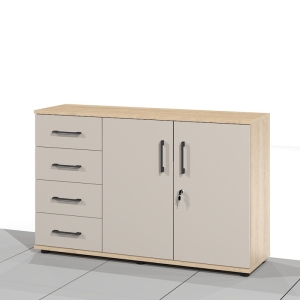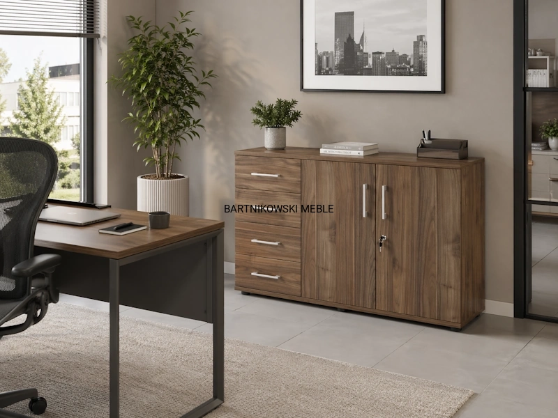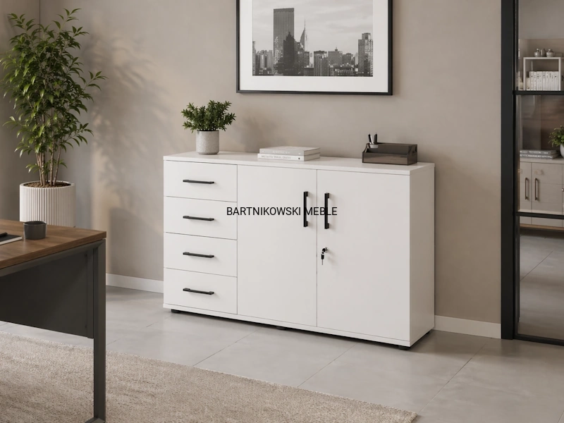 Elegancka komoda do gabinetu z dwoma drzwiami i czterema szufladami. Różne głębokości do wyboru.