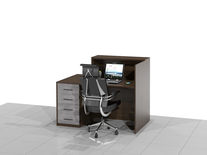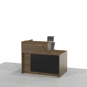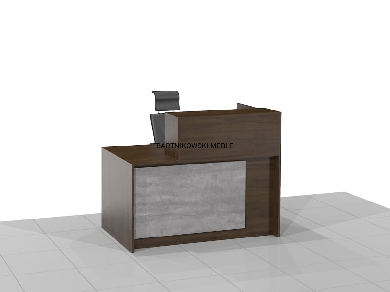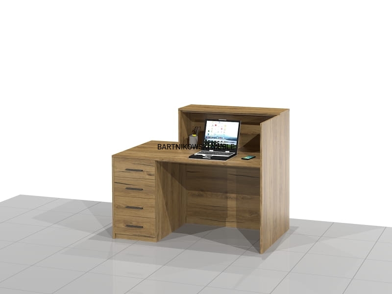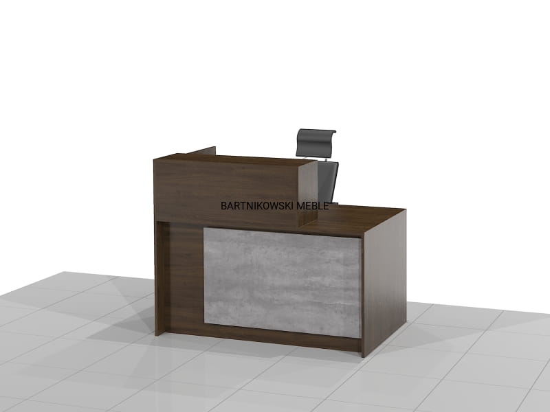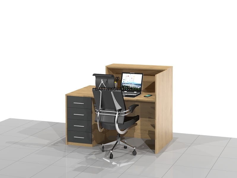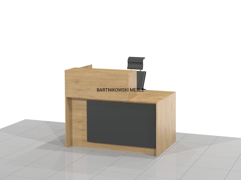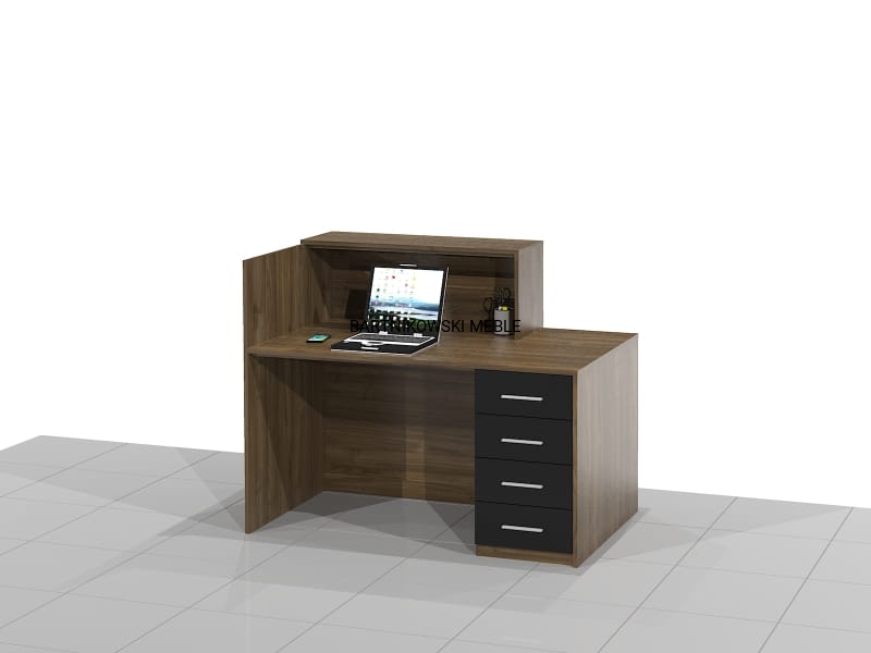 Elegancka mała lada do recepcji z częścią do obsługi na stojąco i na siedząco. Z przodu lady znajduje się panel ozdobny. Długość lady od 140 do 160 cm lub na dowolny wymiar. Od środka szafka z szufladami.