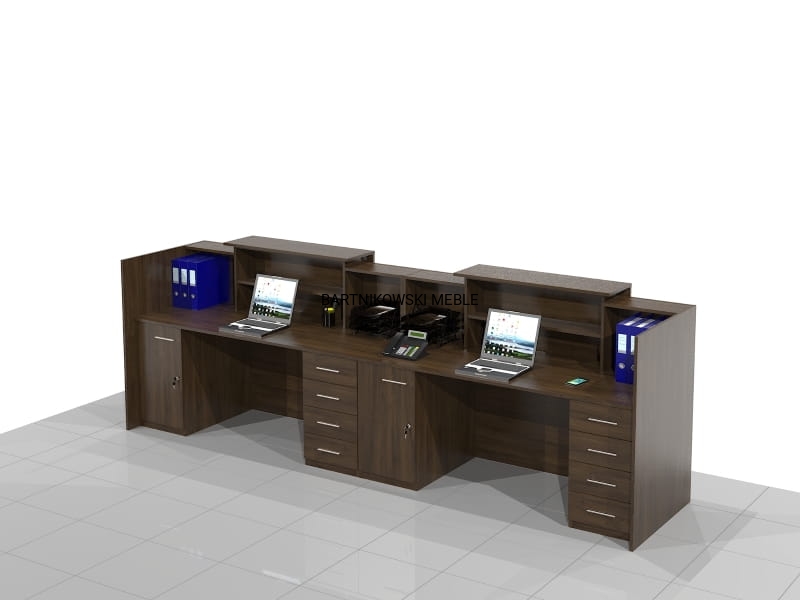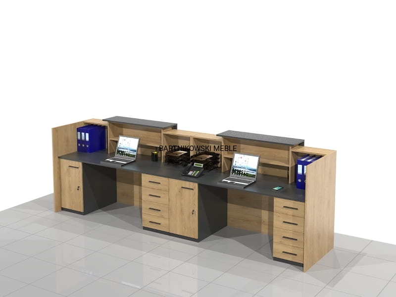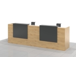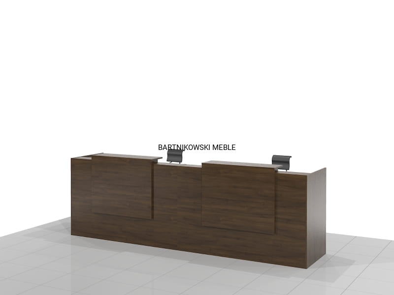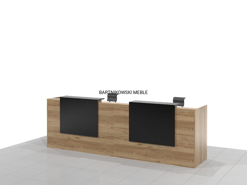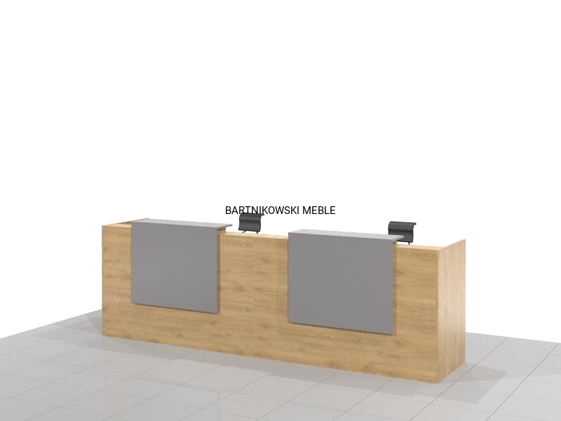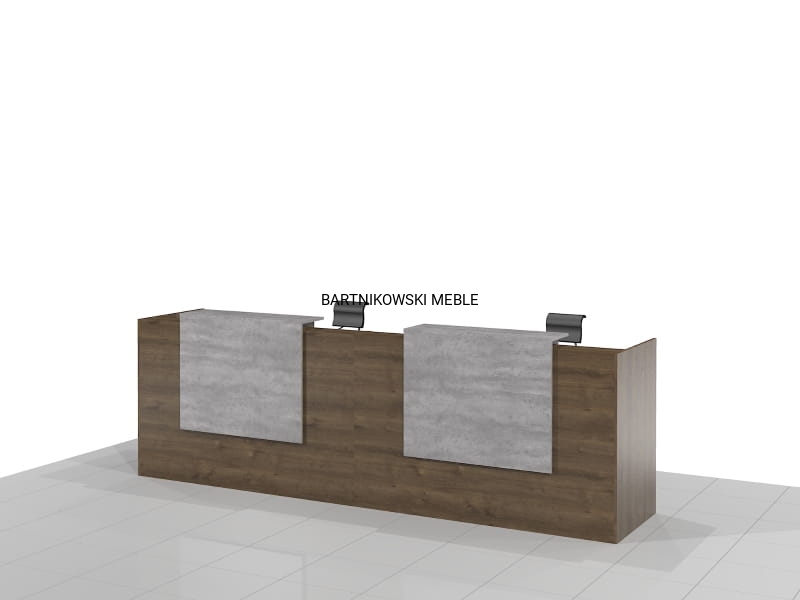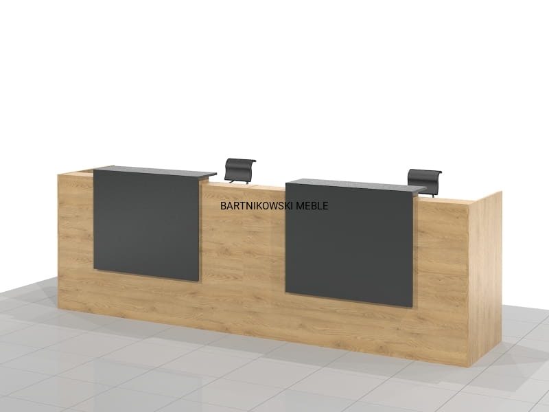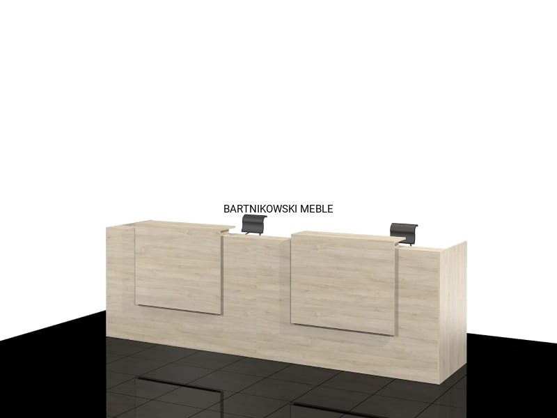 Długa dwuosobowa lada recepcyjna KLARA-B składa się z dwóch części połączonych ze sobą. Z przodu dwa panele z blatem. Długość lady od 280 do 400 cm. Lub na dowolny wymiar.