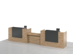 Długa lada do recepcji Dwie części do obsługi po bokach z łącznikiem. W częściach pracowniczych dwie szafki. Jedna z drzwiami i jedna z czterema szufladami. Z przodu dwa panele/blendy.