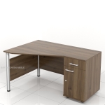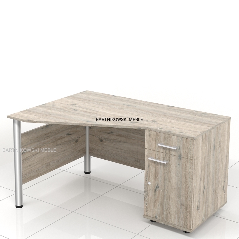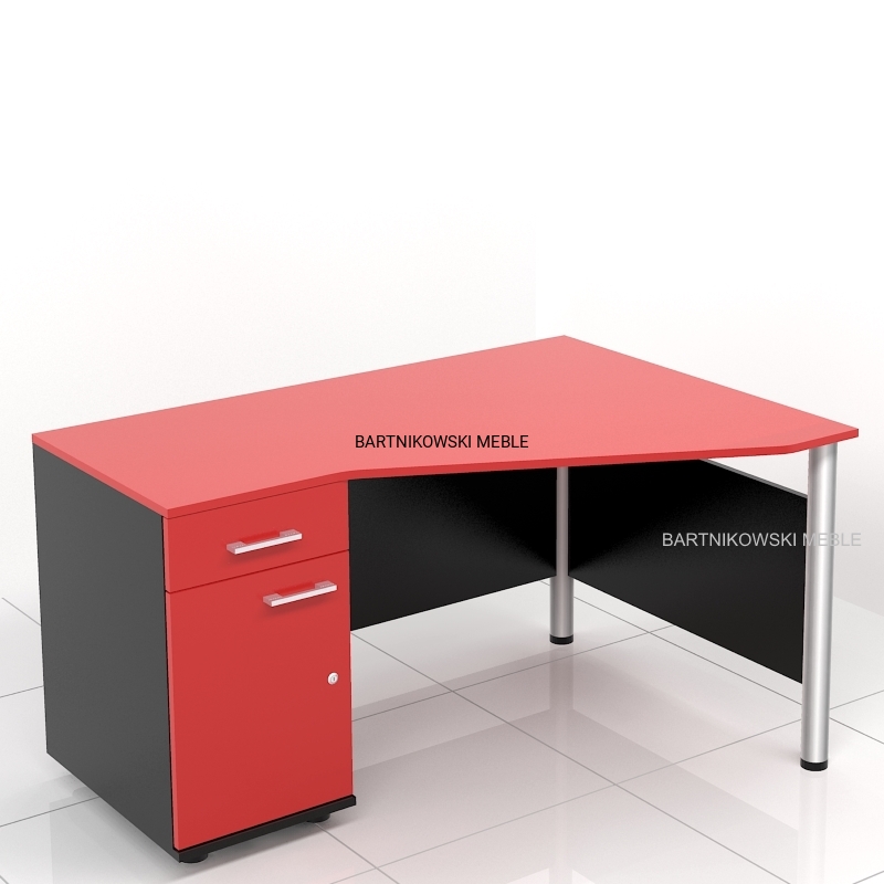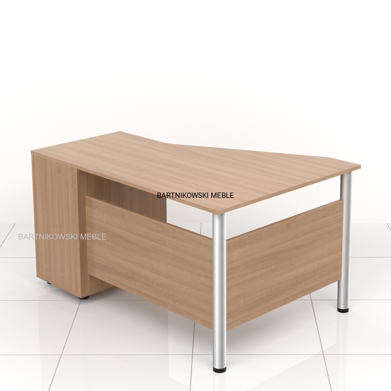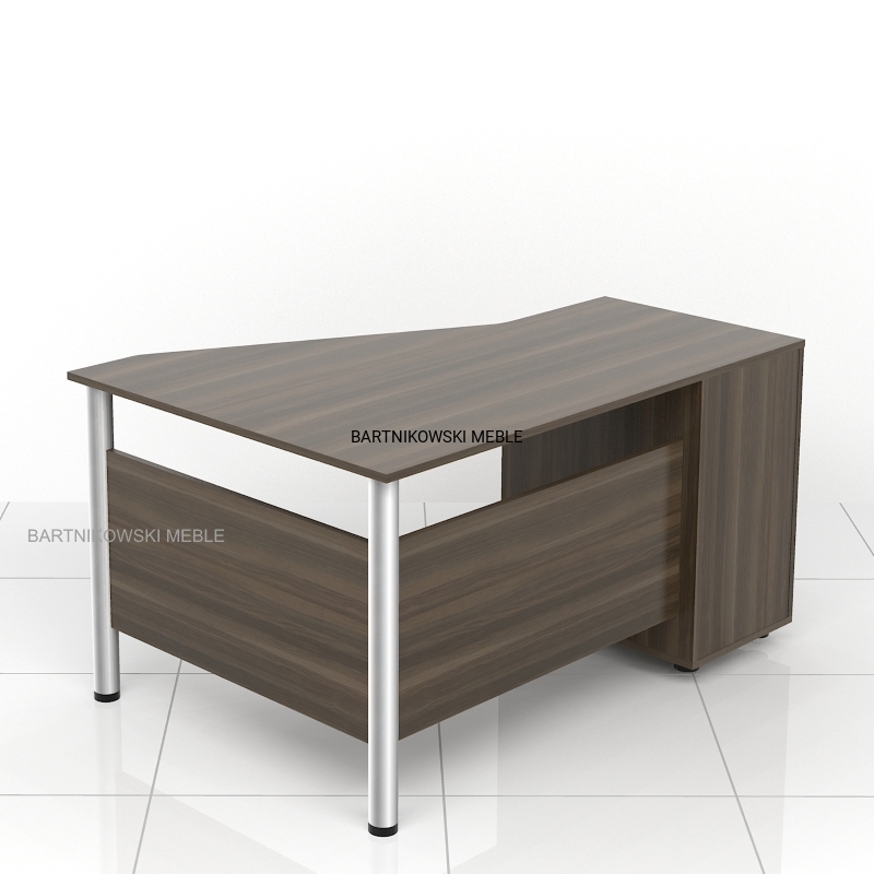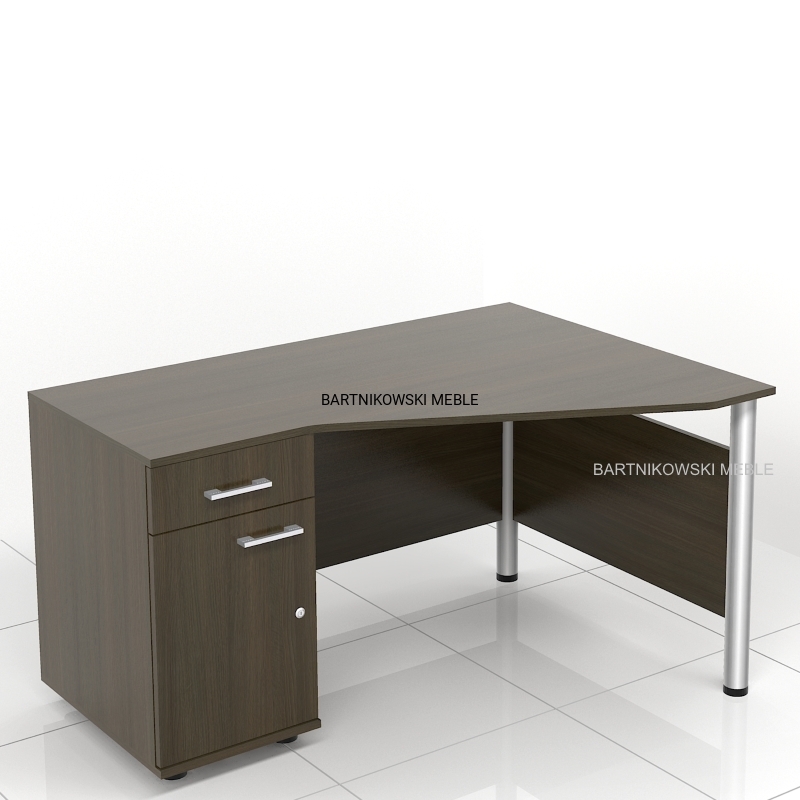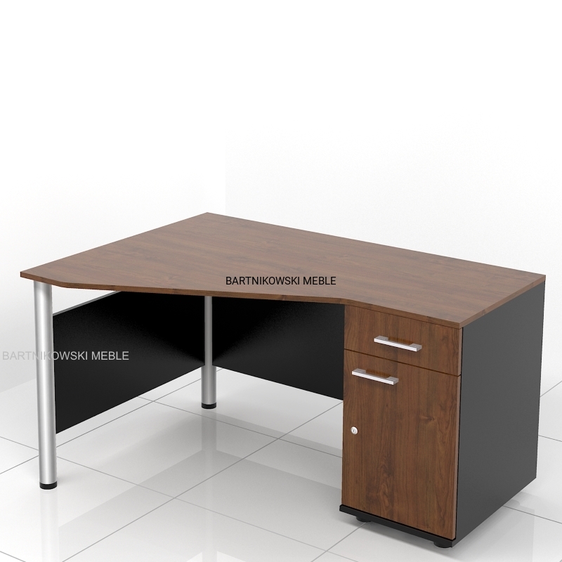 Profilowany w całości blat biurka spoczywa na szafce z szufladą i drzwiami i trzech metalowych nogach. Głębokość szafki wynosi 60 cm. Biurko występuje w wersji prawo i lewostronnej.