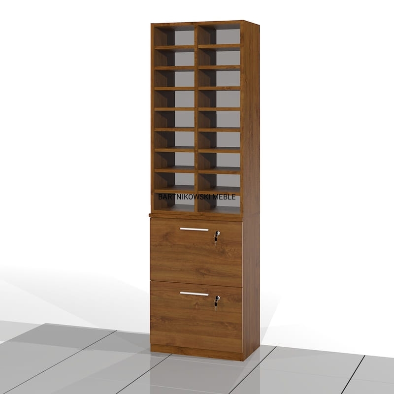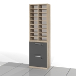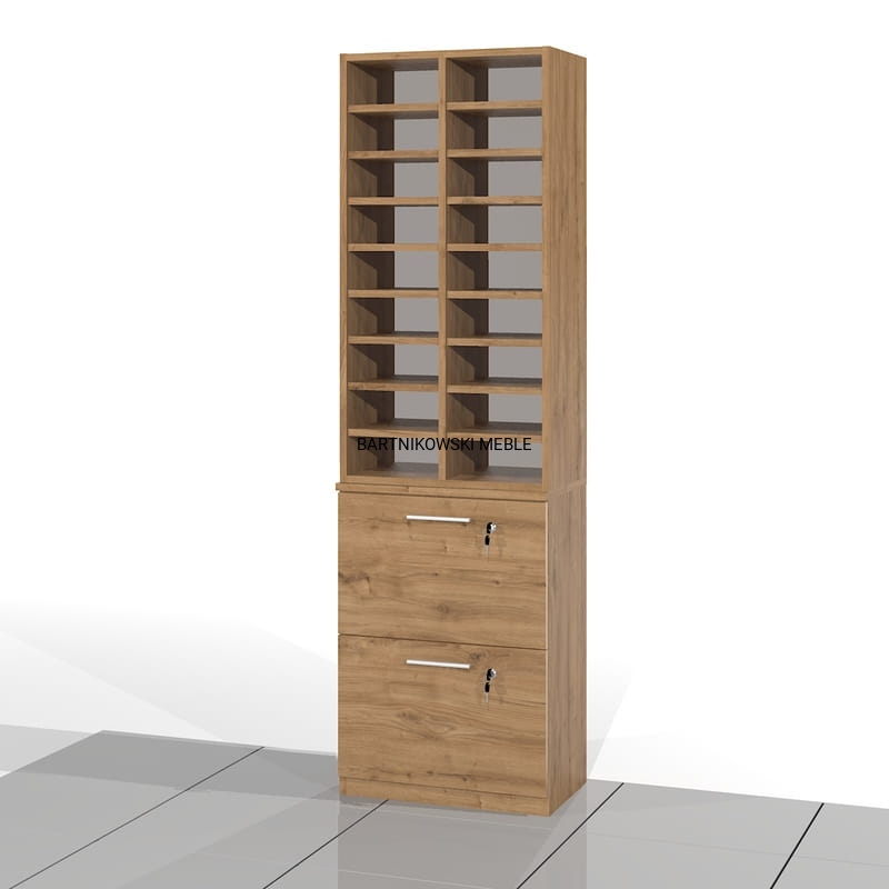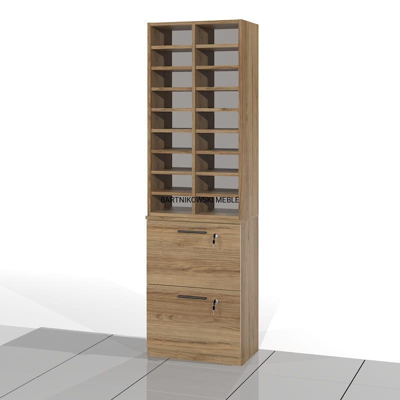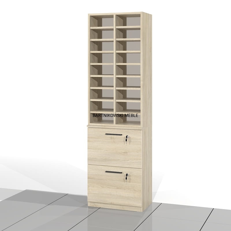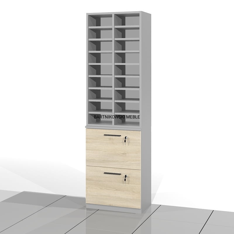 Regał z wnękami do sortowania dokumentów typu RDBX z szafką na akta osobowe zawieszane. Regał wykonany jest w formie nadstawki a podstawę stanowi szafka ELF-SAPW.