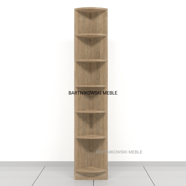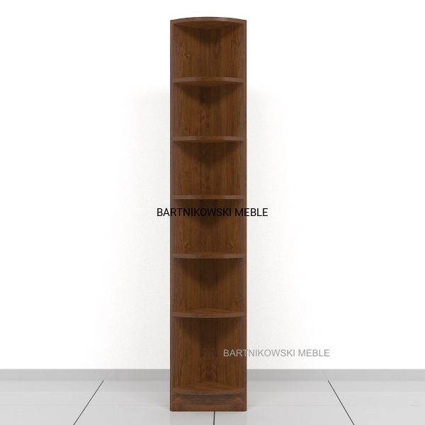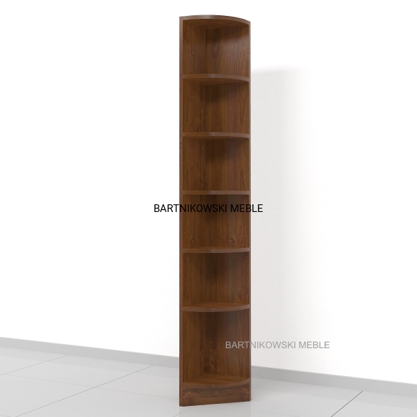 Regał na książki narożny RKGX-001 180h x 25 x 25 cm. Mocny i solidny regał wykonany z płyty wiórowej laminowanej 18 mm. Widoczne krawędzie oklejone PCV/ABS 1 mm. Rozstaw półek od dołu: 33 , 25 , 25 , 25 , 25 , 25 cm.
