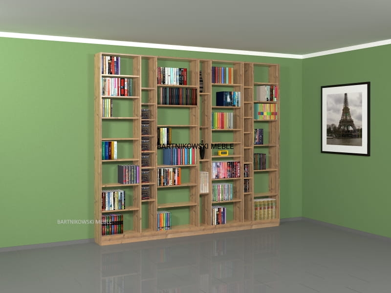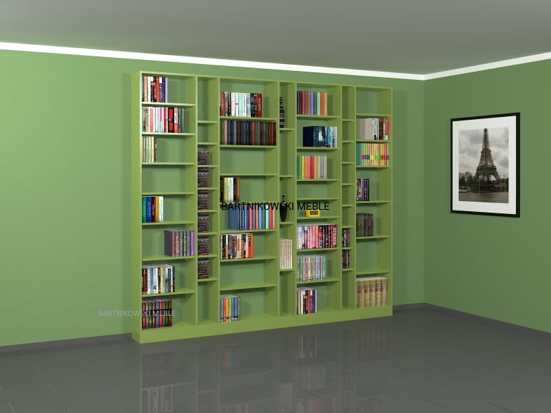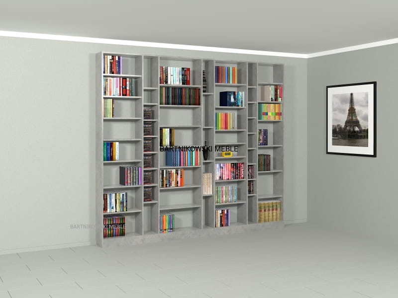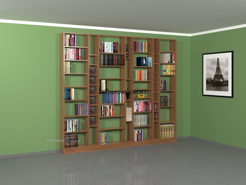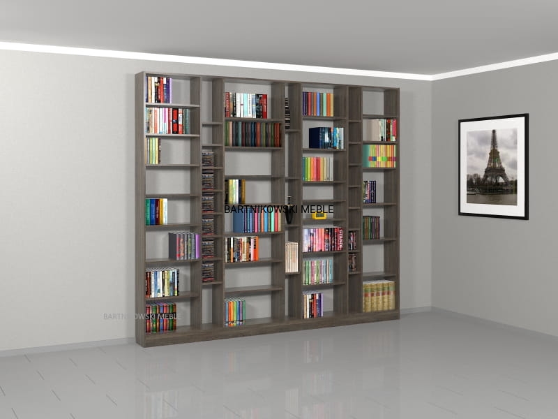 Biblioteczka na książki ALBERT-W2 - 240h x 270 x 27 cm składa się z aż siedmiu kolumn pionowych. Półki umieszczone są na różnych wysokościach dzięki czemu w regale można przechowywać książki i płyty różnej wielkości itp. Regał stoi na cokole o wysokości 9 cm. Biblioteczka nie ma pleców i jest przewidziana z montażem do ściany dla zapewnienia stabilności i bezpieczeństwa. Mimo swoich dużych wymiarów regał zachowuje lekkość optyczną dzięki prześwitom między półkami na ścianę pomieszczenia.