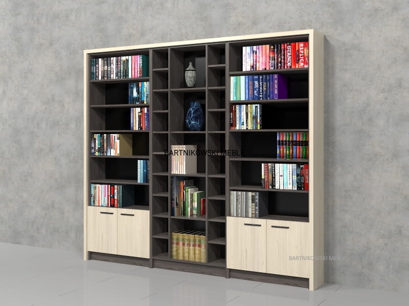 Biblioteczka JULA-W2 to duży regał z przeznaczeniem na książki różnych rozmiarów, płyty, albumy i inne przedmioty. Regały te składają się z 5 pionowych części z czego środkowa posiada duże wnęki, sąsiadujące z nią wąskie kolumny posiadają gęsto umieszczone półki o niskiej wysokości z przeznaczeniem na płyty DVD. Po bokach znajdują się kolumny z półkami na typowe książki a na dole szafki z drzwiami. Na samym dole wysoki cokół. Na życzenie istnieje możliwość wykonania podcięcia w cokole na listwę przypodłogową. Regał wykonany jest z płyty meblowej laminowanej o grubości 18 mm. Widoczne krawędzie wykończone są okleiną PCV. Plecy regału białe lub czarne z płyty HDF 4 mm.