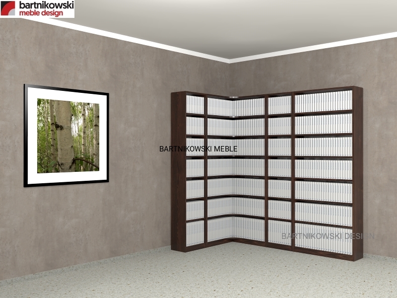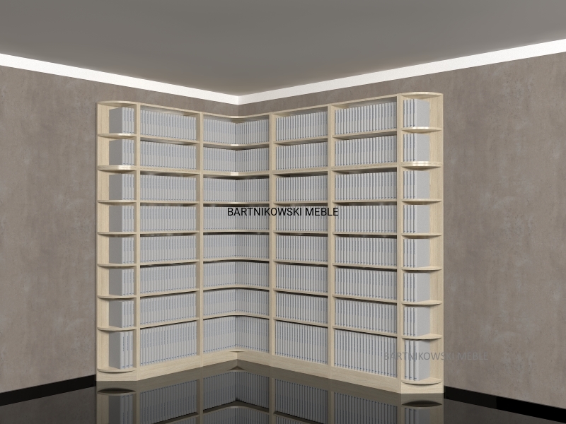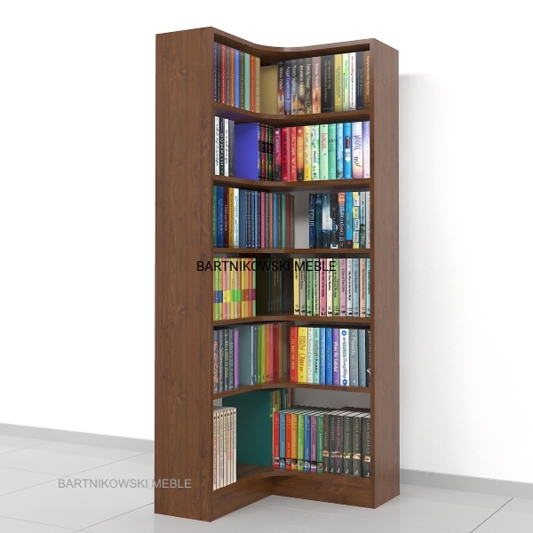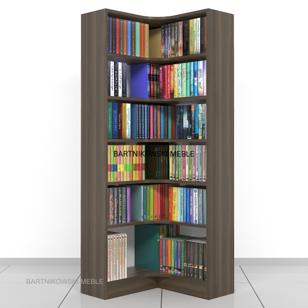 Regał na książki narożny RKEX-001 180h x 70 x 70 x 25 cm. Mocny i solidny regał wykonany z płyty wiórowej laminowanej 18 mm. Widoczne krawędzie oklejone PCV/ABS 1 mm. Plecy regału białe z płyty HDF 4 mm.