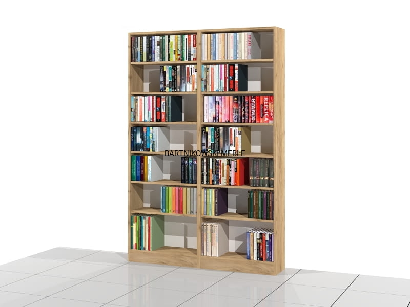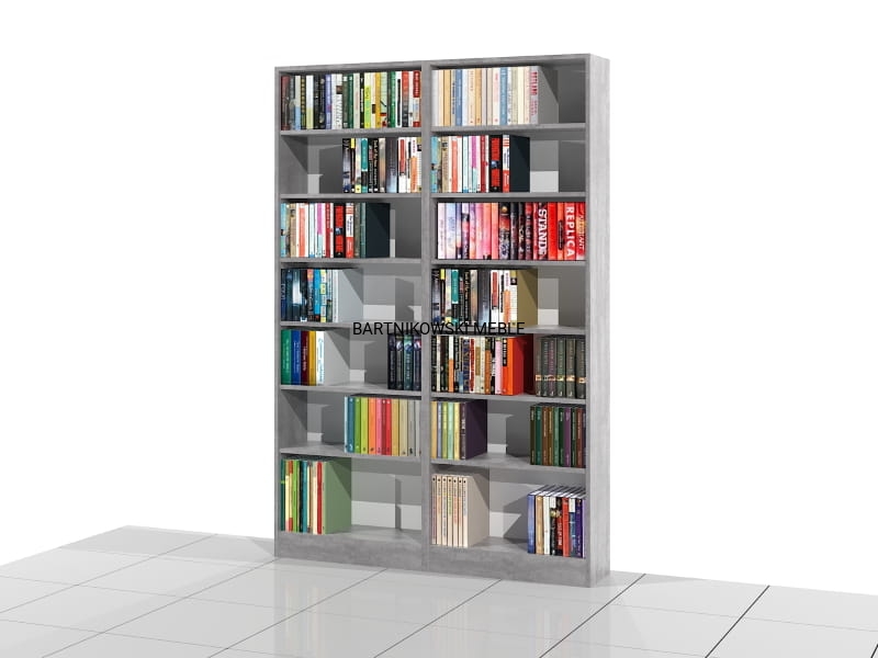 Zestaw 2 regałów na książki o solidnej i mocnej konstrukcji w formie otwartej biblioteki. Całość skręcona ze sobą. Siedem poziomów na książki. Dostarczany w całości zmontowany.