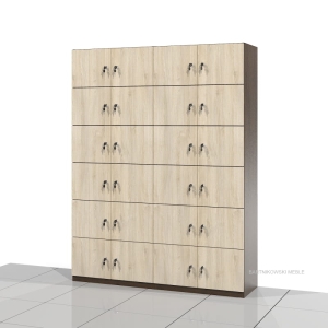 Zestaw 2 szaf socjalnych SSC-01 posiada łącznie 24 wnęki zamykanych drzwiami na zamek. Wymiary wnęki: 27h x 32 x 36 cm.