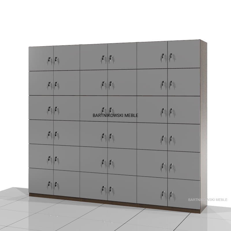 Zestaw 3 szaf socjalnych SSC-01 posiada łącznie 36 wnęk zamykanych drzwiami na zamek. Wymiary wnęki: 27h x 32 x 36 cm.