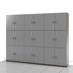 Zestaw 3 szaf socjalnych SSD-01 posiada łącznie 18 wnęk zamykanych drzwiami na zamek. Wymiary wnęki: 56h x 37 x 36 cm.